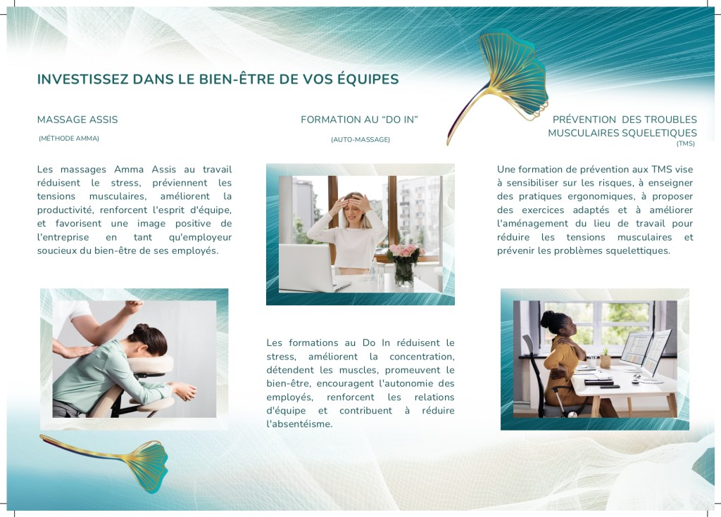 Des solutions ? Oui, LA PRÉVENTION ! Dans ce cadre, je vous propose 3 axes d’intervention : 1. Le massage Amma assis qui présente une série de bienfaits, incluant la réduction du stress, l’amélioration de la concentration, le soulagement des douleurs musculaires, l’augmentation de la circulation sanguine, le renforcement de l’immunité et l’amélioration de l’humeur.